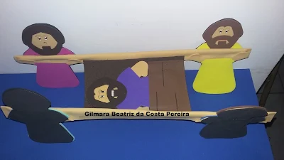 Quatro amigos (faça o número 4 com os retângulos) levaram um paralítico para que Jesus curasse. (faça uma maca com os retângulos). Jesus estava numa casa (faça a casa com o retângulos). Os 4 amigos não puderam entrar pela porta com a maca porque a casa estava cheia de gente. Então, subiram uma escada para o telhado (faça uma escada com os retângulos). Eles tiraram algumas telhas para poder entrar pelo telhado com a maca até Jesus. (faça um quadrado para imitar o buraco com os retângulos). Os amigos desceram o paralítico na maca até Jesus pelo telhado (inverta a posição da maca com os retângulos como se ela tivesse descendo). Jesus curou o paralítico e ele saiu andando ( faça as pernas com o retângulo se movimentando) com seus quatro (faça o número 4) bons amigos.